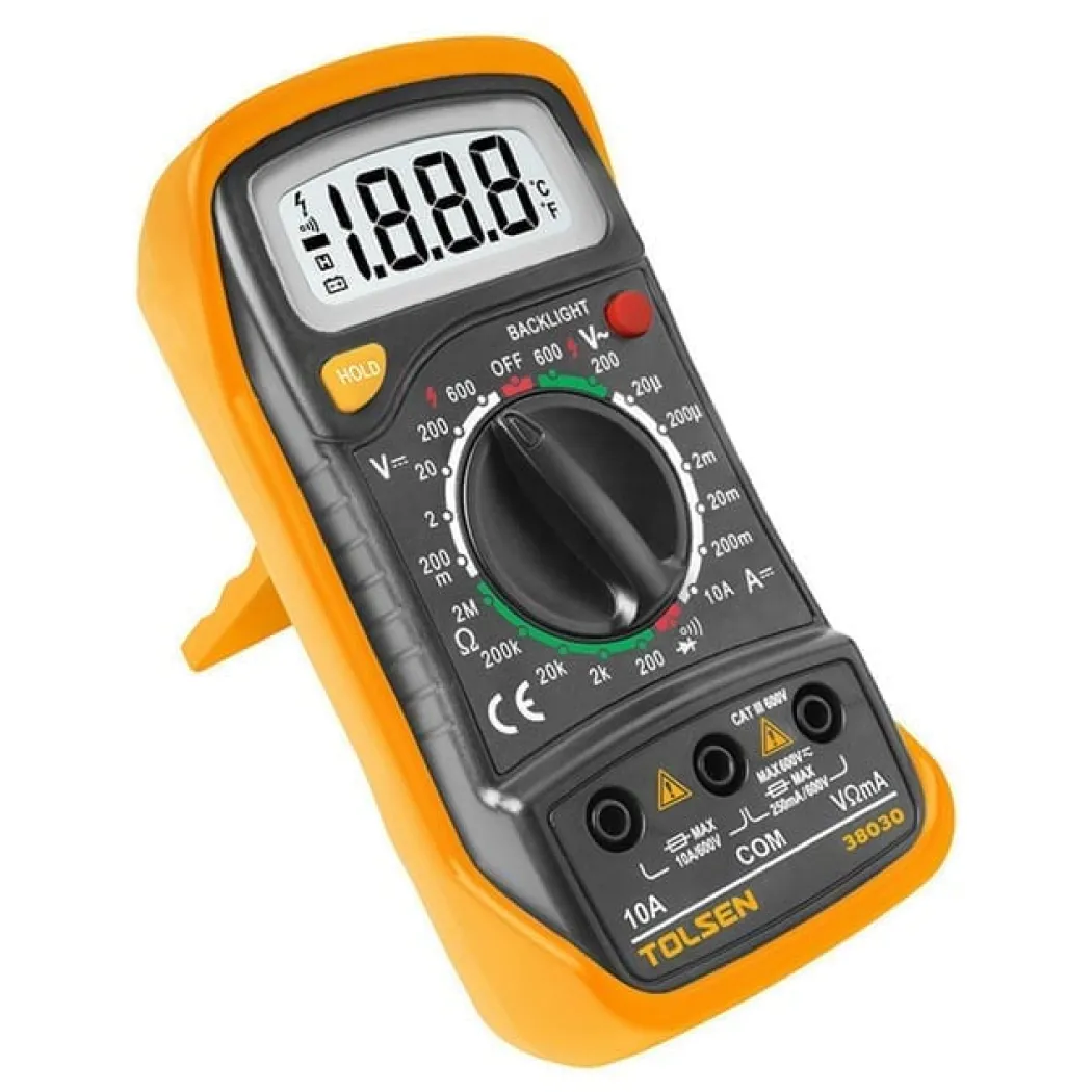 Мультиметр TOLSEN цифровой V-A-Ω 1х9В «Крона» 38030. Мультиметр цифровой с прозвонкой - это универсальный инструмент, который необходим в каждом доме и автомобиле. Он предназначен для измерения тока, напряжения и сопротивления в электрических цепях. Этот инструмент электрика обладает функцией прозвонки и индикатором напряжения, что позволяет быстро и точно определить состояние проводов и оборудования. Мультиметр цифровой также имеет функцию автотестера, позволяющую проверить работоспособность различных устройств и деталей автомобиля. Мультитестер-вольтметр оснащен функцией звуковой индикации(прозвонка).Тестер напряжения имеет 20-ти позиционный переключатель режимов работы и пределов. Полученные результаты отображаются на цифровом дисплее с крупными цифрами. Кроме того дисплей оснащен яркой подсветкой, что позволяет пользоваться им в темное время суток.