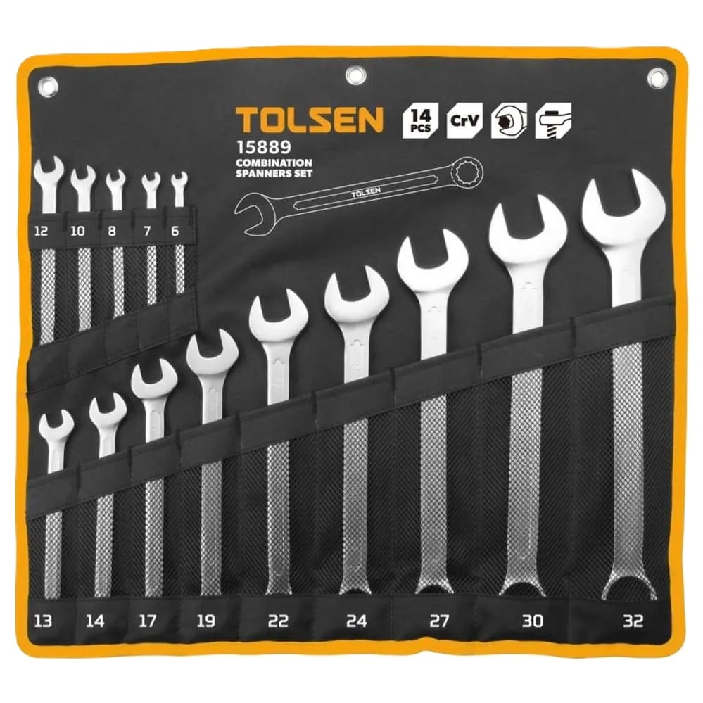 Набор ключей гаечных комбинированных TOLSEN 14шт. 15889 - предназначен для широкого спектра ремонтных работ. Находит применение на станциях технического обслуживания, в автосервисах, строительстве и производстве. Комбинированный ключ является самым распространенным вариантом гаечного ключа т.к. совмещает в себе возможности рожкового и накидного профилей. Инструменты выполнены из качественной хромованадиевой стали. Хромированное покрытие исключает возникновение коррозии.
