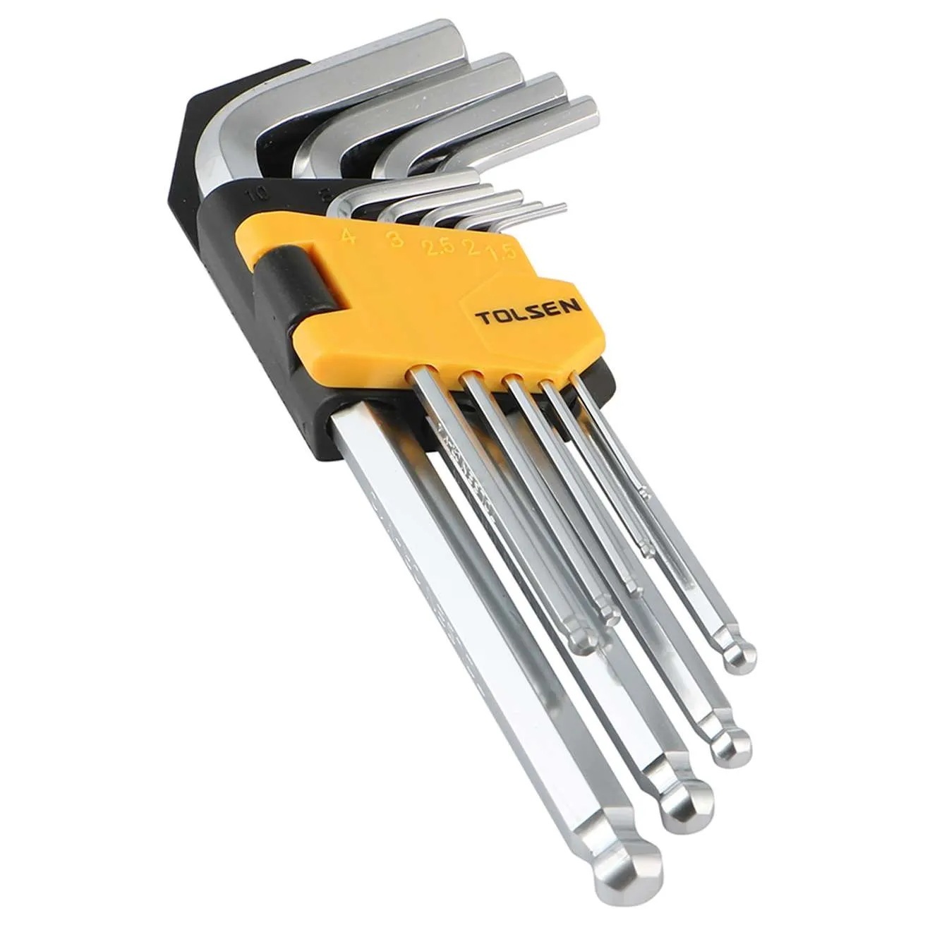 Набор ключей шестигранных шарообразных удлиненных TOLSEN CrV HEX 9шт. 20053 - предназначен для работ с крепежными винтами с шестигранным шлицем. Набор может использоваться в бытовой и профессиональной сферах. Ключи выполнены из инструментальной хромованадиевой стали со специальным закаливанием, что обеспечивает прочность и надежность. Шаровая форма на длинном плече ключей удобна для работы под наклоном до 30°.