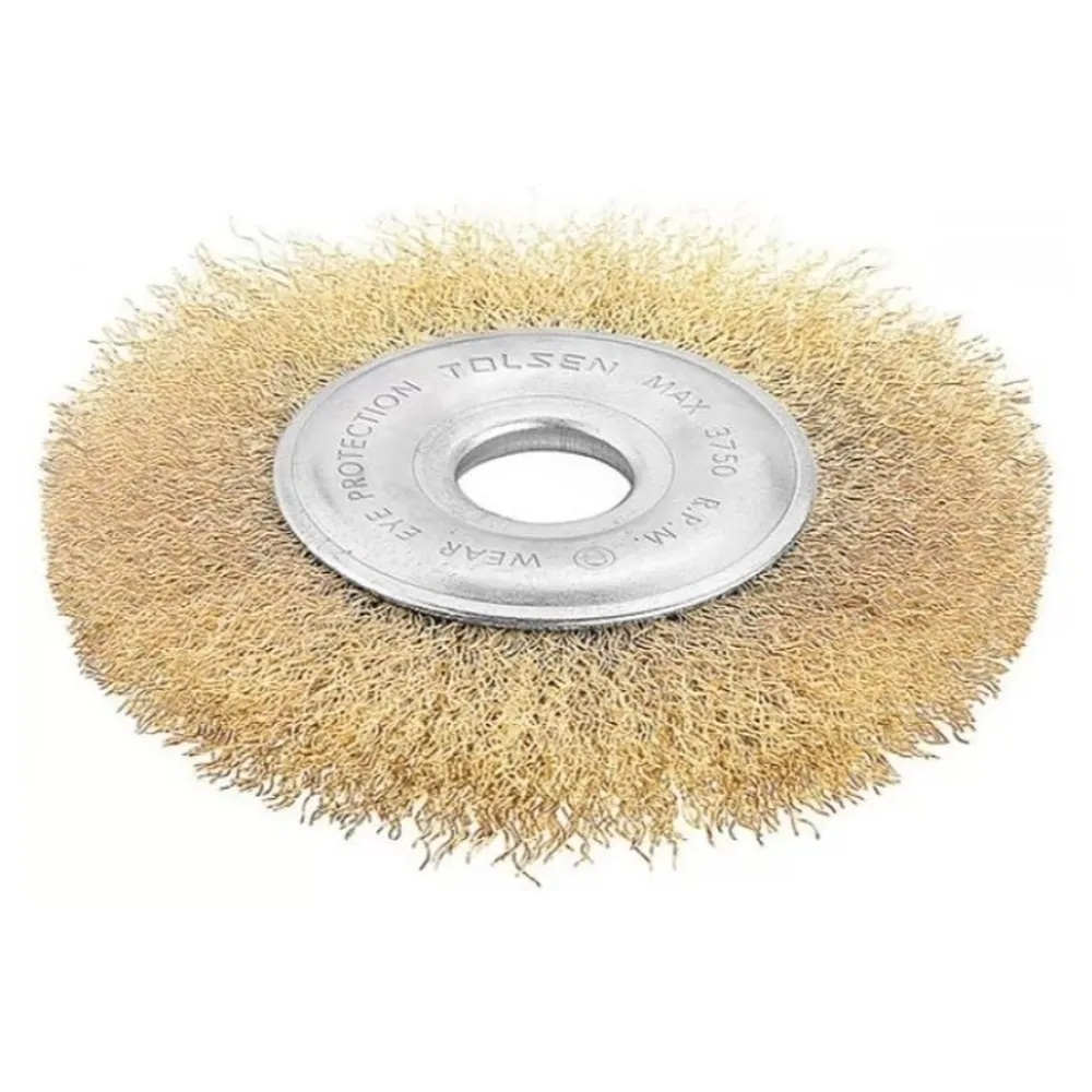 Щетка дисковая проволочная латунированная сталь TOLSEN 100х22.2мм 77527 - Щетка  для углошлифовальной машины (УШМ) – идеальный инструмент для эффективной обработки различных поверхностей. С плоской формой и посадкой 22.2 мм, она обеспечивает надежную фиксацию и легкость в установке. Диаметр 100 мм делает щетку универсальной для различных задач, таких как удаление ржавчины, чистки сварочных швов и обработка древесины. Отлично подходит для применения в строительстве, ремонте и при проведении плотницких работ. Высококачественные металлические щетинки обеспечивают долговечность и стойкость к износу, что гарантирует качественное выполнение работы в короткие сроки. Благодаря удобному дизайну, эта щетка позволяет работать с максимальной эффективностью, экономя ваше время и усилия.